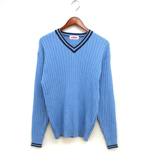 【中古】イクシーズ IXI:Z Vネック セーター ニット リブ コットン混 ストライプ 長袖 L 青 ブルー /NT13 メンズ