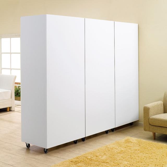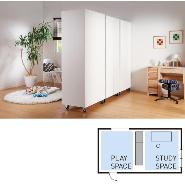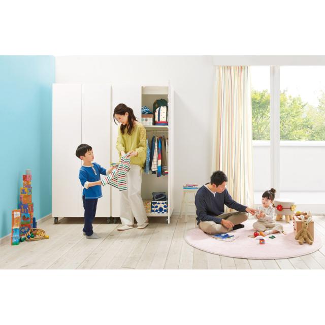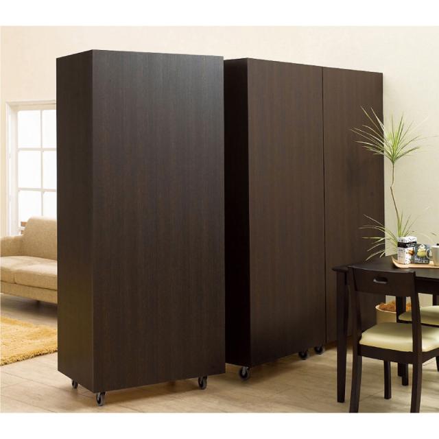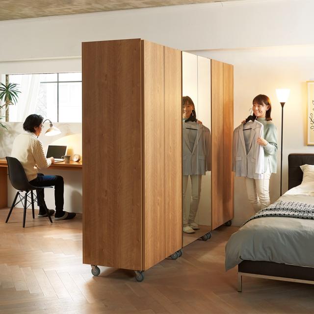板扉で自然にお部屋を間仕切れる壁面収納ワードローブ。広いリビングやダイニングの空間を仕切って使いたい方におすすめです。キャスター付きでお部屋のレイアウトも簡単に変えられます。