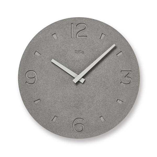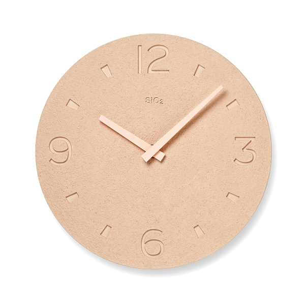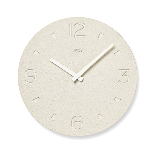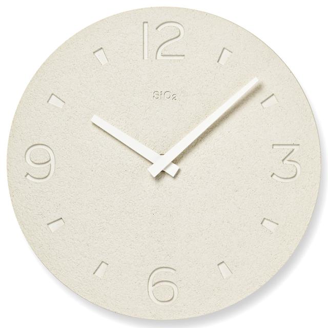藻類の一種である珪藻が海底に堆積し、長い年月を経て岩石となった珪藻土。その珪藻土を使用し、日本の伝統技能である「左官」の技術を用いてつくられた時計です。立体感のある形状は自然光の中で刻々と陰影を変化させ、時の経過を感じることができます。素材の特性と雰囲気を最大限に生かしたデザインで、木や漆喰で設えた和の空間やモダンな空間のインテリアとしても最適です。(時計ロゴのSiO2とは、珪藻土の主成分である二酸化ケイ素の元素記号です。)
