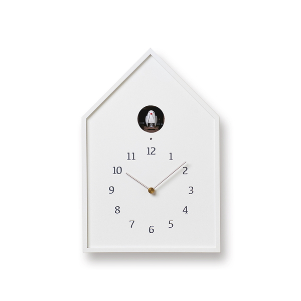 さんかく屋根のシンプルな巣箱の形状をシナベニヤを組み立てて製作しました。シナの柔らかな木目が見えるナチュラルと、家の形が引き立つホワイトの2タイプ。控えめでもはっきり見える数字フォントに金属でできた時計の針がアクセントになっています。ライトセンサー機能付きで、就寝時など消灯時には小鳥もお休みするので音の心配もありません。部屋に朝日が差し込むと小鳥も目覚め、優しく起こしてくれるかもしれません。