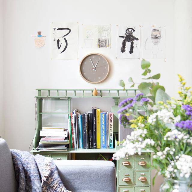 ポピュラーなホワイト、空間のアクセントにもなるマスタードイエロー、グレイッシュで上品な印象のグレージュ、ブルーグレーの4カラー。真鍮色や銅色の秒針が盤面のアクセントになっています。