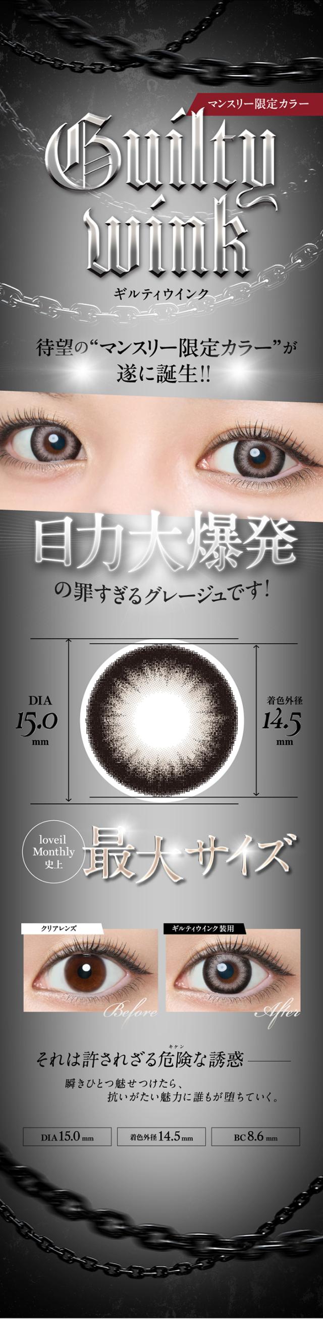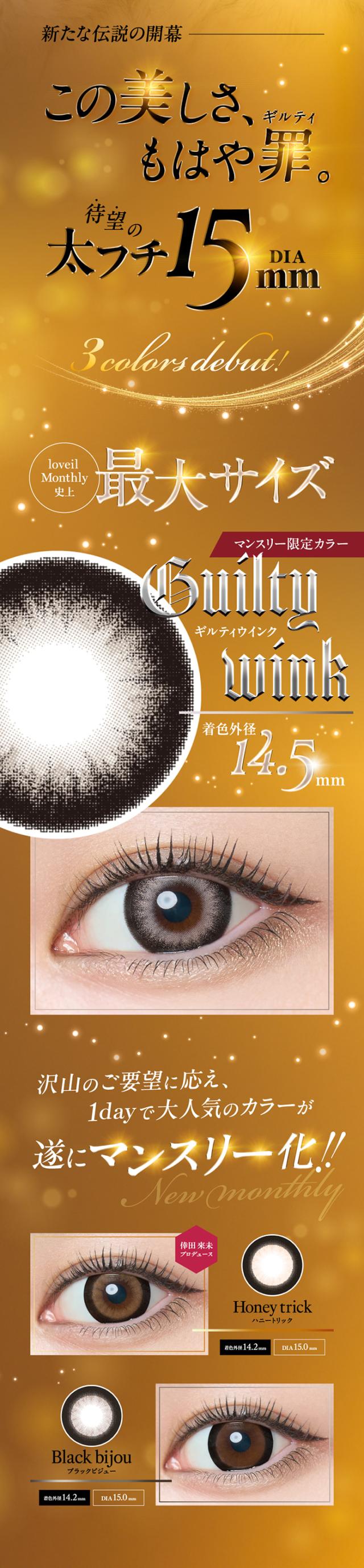 | DIA | 14.5mm:アディクトブロンド/バブルギャラクシー/ルモアヴィーナス/キャラメルグロー 15.0mm:ハニートリック/ブラックビジュー/ギルティウインク |