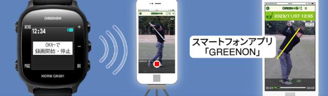 スマートフォンアプリ「GREENON」と連携し、簡単に自分のスイング動画の記録とスイングチェックができます。
