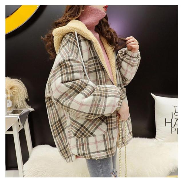 裏ボア ジャケット レディース パーカー アウター 前開き ビッグシルエット コート チェック柄 ボアコート ミドル丈 フード付き 厚手 暖かい 秋冬 冬服 ゆったり かわいい 送料無料
