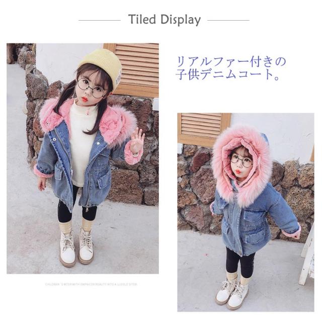 | リアルファー付きの子供デニムコート。 表地はデニム素材、裏側は厚手のボア素材で防寒効果抜群。 配色のリアルファー付きで首周りも暖かい。 普段着はもちろん、通園通学、アウトドアなどの場合に大活躍するアイテム。 | |