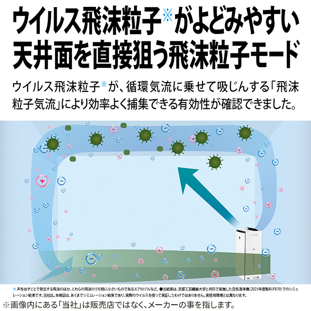 ※1 商品を壁際に置いて、「中」運転時に部屋中央(床上1.2m)で50,000個/cm³のイオンが測定できる床面積の広さです。