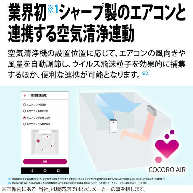 ※2 適用床面積は風量「強」で運転したときの面積です。加湿空気清浄運転時は「日本電機工業会規格(JEM1426)」に基づき、プレハブ住宅洋室の場合を最大適用床面積とし、木造和室の場合を最小適用床面積としたものです。ただし、壁・床の材質、部屋の構造、使用暖房器具などによって適用床面積は異なりますので、メーカーにご相談ください。空気清浄運転時は「日本電機工業会規格(JEM1467)」に基づくものです。
