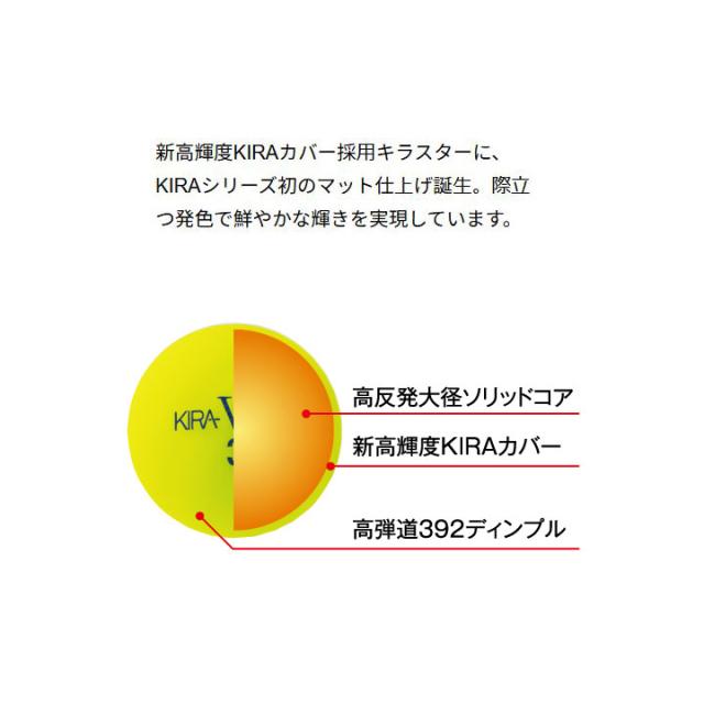 ソフトなフィーリングと高弾道が楽飛びを実現。マット仕上げのKIRAボール。際立つ発色で鮮やかな輝き。