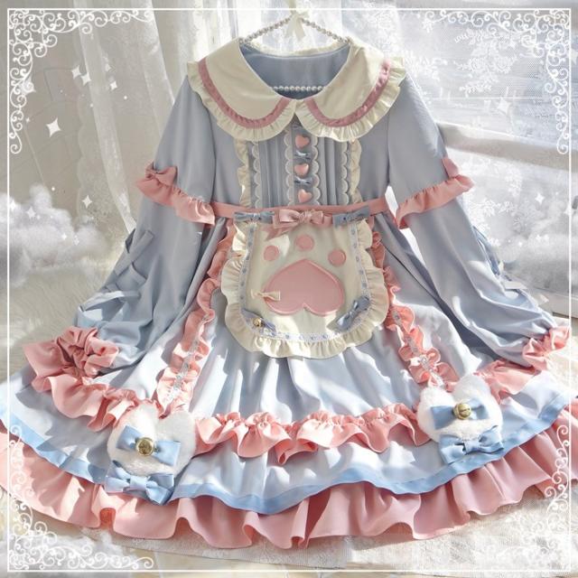 メイド服 ロリータ ワンピース 長袖 ネコエプロンロリータワンピース 洋装 コスプレ 衣装 森ガール可愛い 猫 可愛い ガールズ エプロン コスプレ衣装 姫 エプロン 髪飾り 膝丈 フリル 森ガール お茶会 お嬢様 cosplay lolita 学園風 学園祭 文化祭 ゆったり 水色 aa140zbzbm5