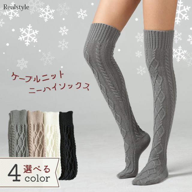 ニーハイソックス 靴下 レディース 白 厚手 黒 暖かい 冬 オーバーニー サイハイ ニット ルームウェア 防寒 おしゃれ ケーブル編み