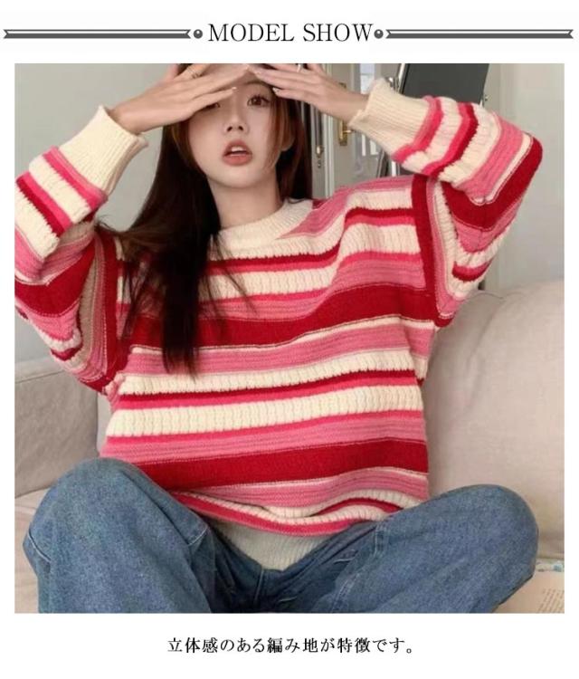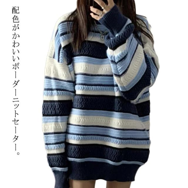 カジュアル セーター 長袖 ニット ボーダー柄 プルオーバー オーバーサイズ ニットトップス 大きいサイズ ニット クルーネック ゆったり おしゃれ かわいい ボーダー配色 通勤 秋 冬