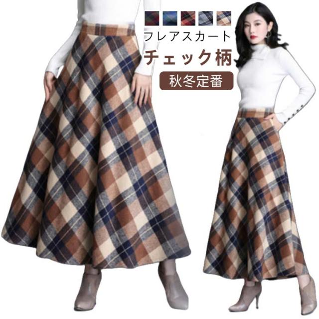 ロングスカート タータンチェック 40代 ハイウエスト スカート フレアスカート マキシ丈 チェック柄 秋冬 ウール調 30代 マキシスカート 着痩せ お洒落 厚手 暖い
