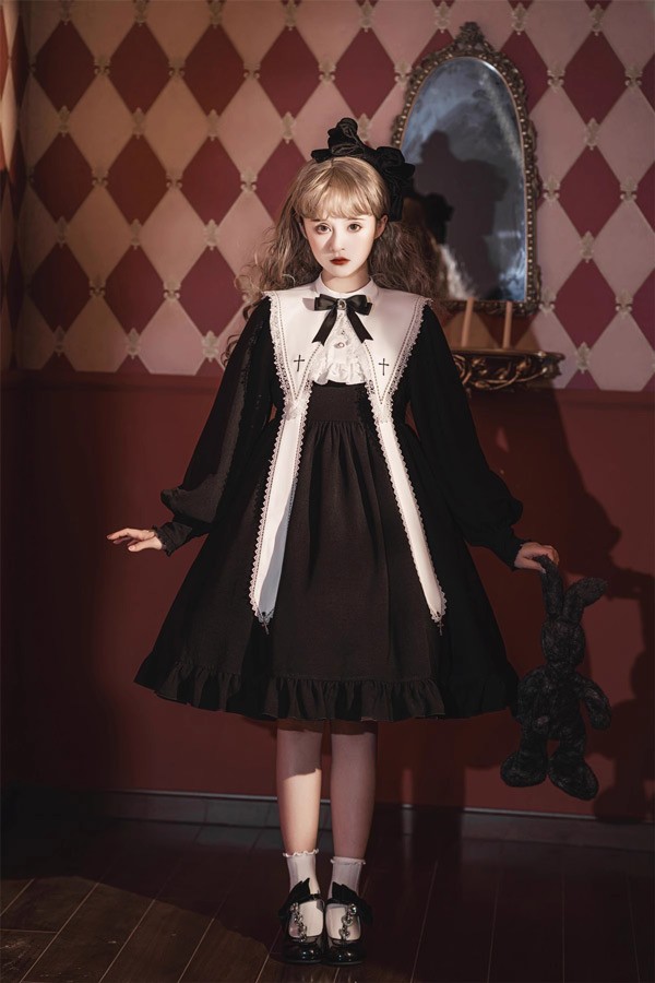 ワンピース ロリータ ハロウィン シスター風 膝丈 レディース ゴスロリ ハイウエスト Aライン 暗黒風 ロリィタファッション 長袖 リボン フリル プリンセス風 洋服 可愛い セクシー 宮廷服 日常 仮装 文化祭 学園祭 春夏秋冬用 ホワイト ブラック 黒 S M L da530m4m4m5