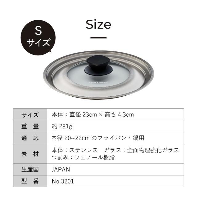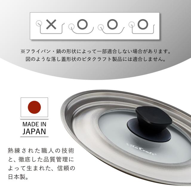 内径20cm・22cmのフライパンや鍋兼用のステンレス製カバーです。スーパー鉄シリーズに対応。幅広い製品に対応。スーパー鉄シリーズやコーティングフライパンはもちろん、鍋製品(落し蓋形状のもの除く)にもお使いいただけます。複数サイズに対応しているので、収納スペースも節約できます。純正品だから安心。本体は丈夫で錆びにくいステンレス製。調理の様子が確認しやすいガラス窓には、ビタクラフトのロゴ入り。安心のMade in Japan品質です。