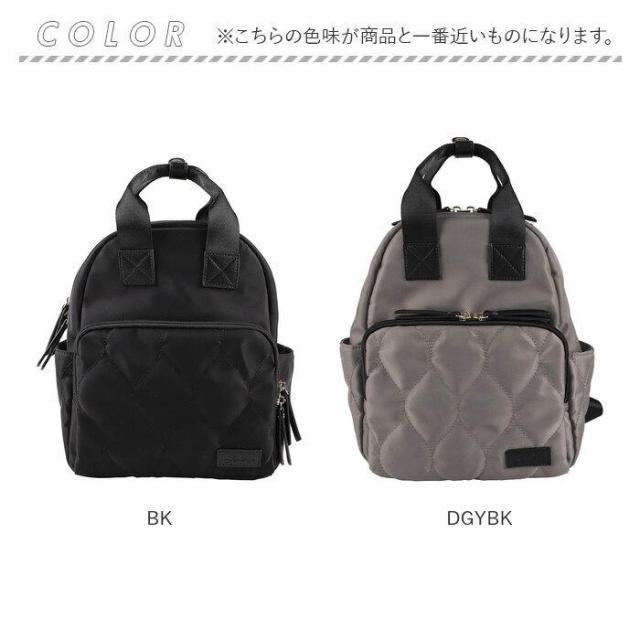 【おしゃれに持てるお出かけの相棒】大人な仕上がりで使い勝手も抜群。「LIZDAYS キルティングナイロンリュックサック」。【ころんと可愛らしいミニサイズ】必需品をまとめて、手軽に持ち歩き。デイリーに使いやすく、小柄な方にもおすすめ。【ガバっと開くダブルファスナー】左右どちらからもオープン。中身を確認しやすく、出し入れに手間取らない!【B5対応ですっきりひとまとめ】B5がぴったり。コンパクトに見えて、ポーチなど必要な物はしっかりと収納。(※1)B5対応ですが、物によっては角が折れる可能性がありますのでご注意ください。【嬉しいメイン直結ファスナー付き】リュックを背負ったままでも背面ファスナーを開いて、荷物の取り出しが可能。【サクッと取り出せて迷子知らず】内側・外側合わせて6個のポケット付き。バッグの中で小物を探す手間が不要。【背負い心地軽やかでストレスフリー】体に負担がかかりにくい軽量設計◎背面とショルダーには、クッション性をプラス。【夏場でもムレにくいメッシュ生地】ショルダーは通気性の良いメッシュ仕様。暑い季節の長時間移動も、サラッと快適。【リュックを下ろすシーンで便利】電車の中などで下ろす時も腕に掛けやすいハンドル。スナップボタンでまとめることが可能。【丈夫でキレイなフォルムをキープ】耐久性のあるナイロン素材を使用。崩れしにくく、ガシガシ使えるのが嬉しい!【ちょっとの雨なら大丈夫】表面は汚れや水滴を弾きやすい、撥水加工済み。お手入れも拭き取るだけ。(※2)完全防水ではありません。【上品な印象のキルティングデザイン】落ち着きのあるカラーに、ふっくらキルティング♪どんなコーデにも素敵にマッチ。【ポケット仕様】内側:ファスナーポケット×1、メッシュポケット×1、ボトルポケット×1前面:ダブルファスナーポケット×1サイド:オープンポケット×2