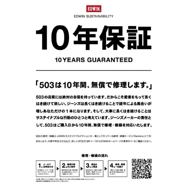 デニム製品に限り、サステイナブルアクションの一環として行っているEDWINの修理補修サービス『Re:dwin』にて製造から10年間無償で修理補修対応致します。カラーアイテムは対象外となります。詳しくは下記EDWINの修理補修サービス『Re:dwin』をご確認ください。