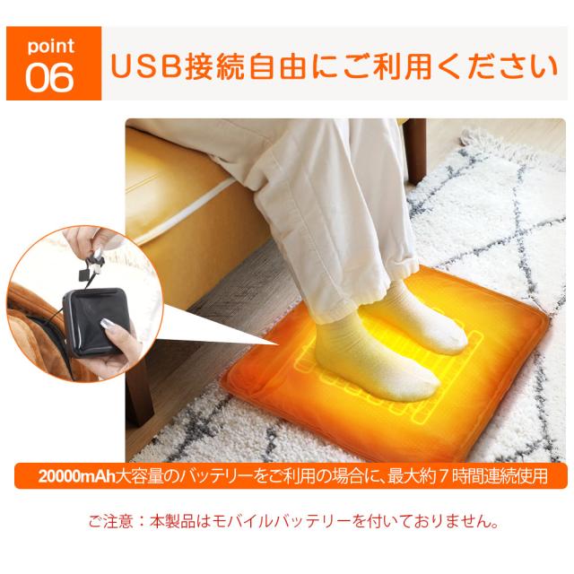 【 USB給電式足温器】USB給電式で、モバイルバッテリーと接続して暖を取ることが可能、自宅やオフィスはもちろん、アウトドアやレジャーなど電源を確保できない場所でも使えます。