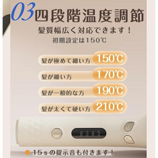 【4段階の温度調整】温度ボタンを押すと、温度が選択できます。髪質に合わせて、好みの温度に設定可能。210℃:くせの強い髪、290℃:太くて硬い髪、170℃:一般的な髪、150℃:細かくて柔らかい髪。