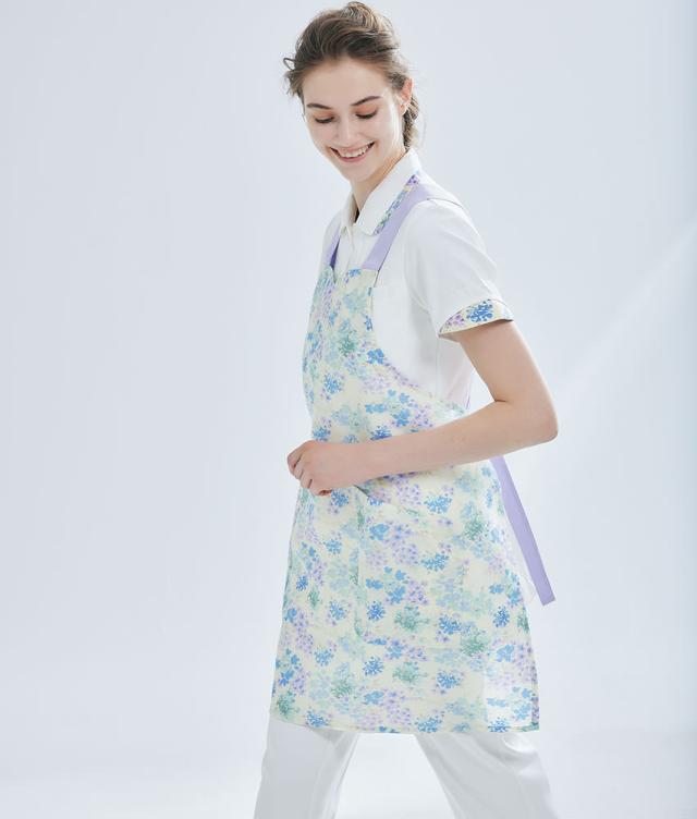 花のように鮮やかなカラーバリエーション。襟もとのスリットや花柄パイピングなど小技を効かせた心ときめくパステルカラーのエプロン。