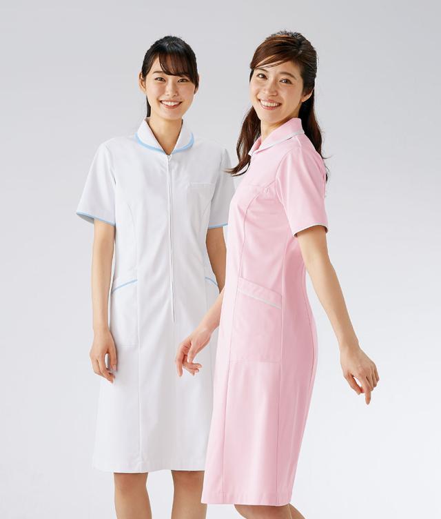 住商モンブランのメディカルワンピース、制菌・透け防止・制電・防汚加工を付与、かわいいデザインに配色トリミングでシャープに