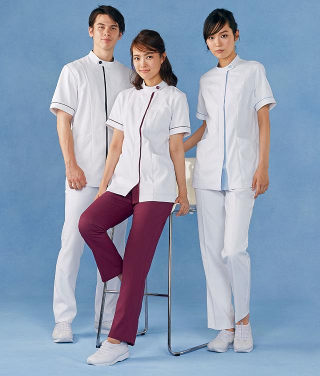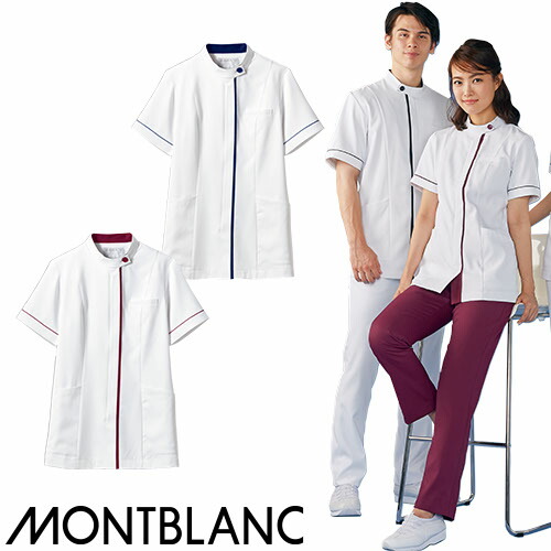 住商モンブランのメディカルジャケット ケーシータイプ、制菌・透け防止・吸汗速乾・制電・防汚加工を付与、タテのカラーラインで、スッキリ洗練された印象に