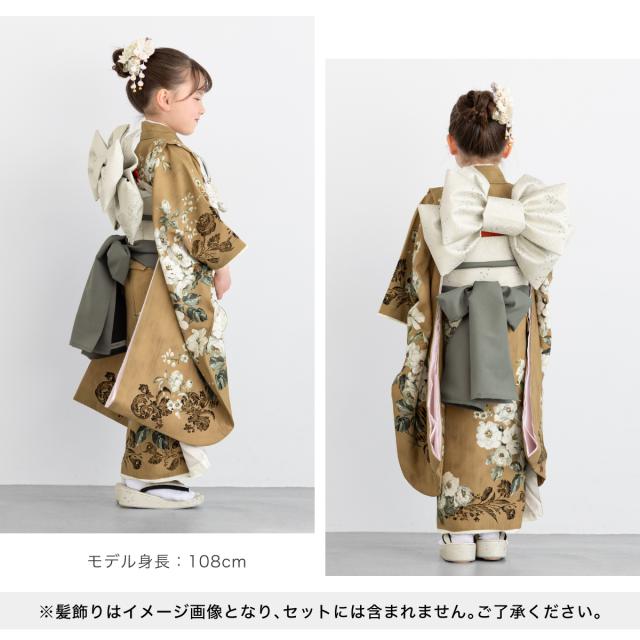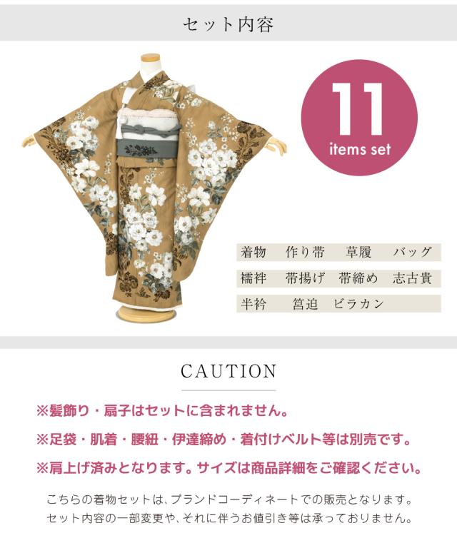 ※本商品は【着物(肩上げ済)・作り帯・草履・バッグ・襦袢・帯揚げ・帯締め・志古貴・半衿・筥迫・ビラカン】のセットです。セット内容の一部変更や、それに伴うお値引き等は承っておりません。