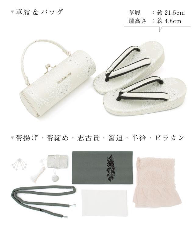 セット内容は【着物・襦袢・半衿・作り帯・はこせこ・びら簪・帯締め・帯揚げ・しごき・草履・バッグ】の豪華な11点です。