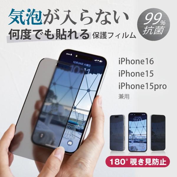 iPhone16 保護フィルム iPhone15 15Pro 抗菌 iPhone 16 15 pro アイフォン PET フィルム 180度 覗き見防止 繰返し貼れる 指紋防止 気泡レス 画面保護フィルム