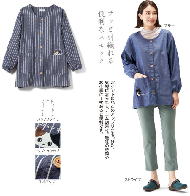 さっと羽織れる便利なスモック。BRポケットにねこのアップ…