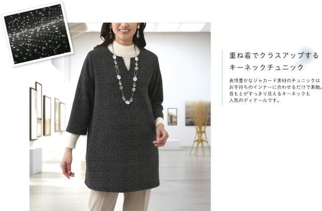 重ね着でクラスアップするチュニック。首もとがすっきり見えるキーネックが人気!表情…