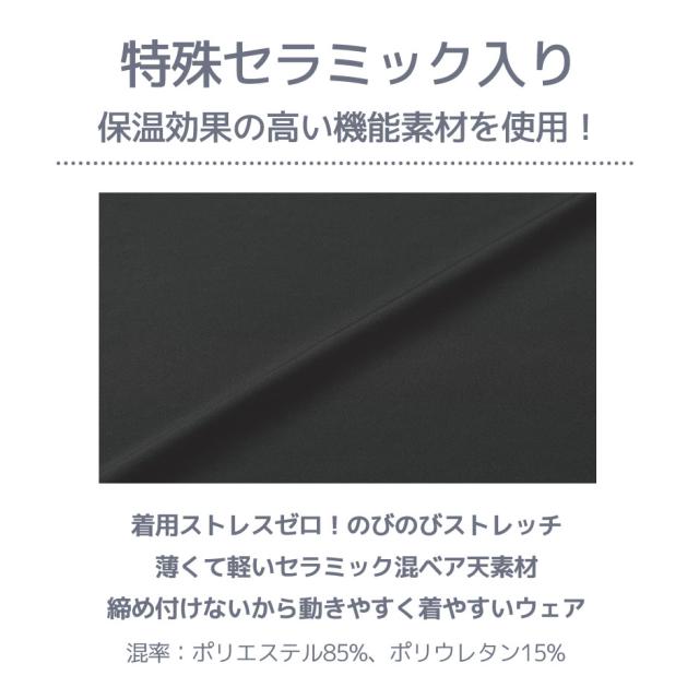 セラミック混ベア天(ポリエステル85%、ポリウレタン15%)特殊セラミックの粉末が練り込まれた機能素材を使用。人の身体から放射される遠赤外線を吸収し輻射することで温もりを保ち保温効果を与えます。軽くて薄く、伸縮性の高い生地に編み上げました。
