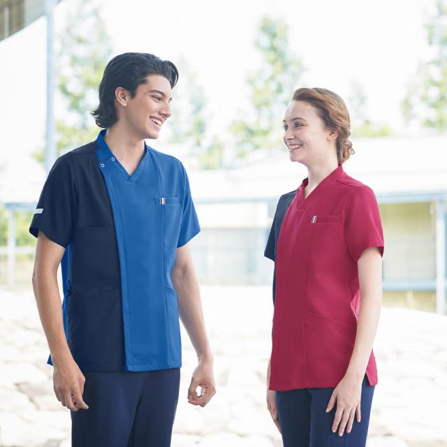 薄くて軽く、ストレッチ性がありながら、ハリがあって着くずれしづらい素材。いつでも清潔感のあるきちんとした印象を保ち、患者様からの信頼感を高めます。通気性がよくストレスフリーな着心地で、長時間着用していただいても快適です。
