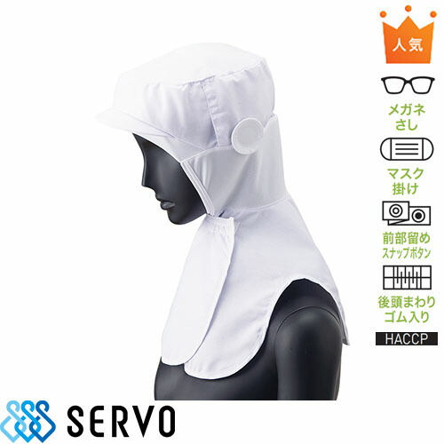 眼鏡さし,マスク掛け,前部留めスナップボタン,後頭まわりゴム入り,HACCP対応