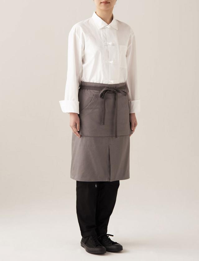 通気のよいヘアコード生地を使用し軽くて涼しいコートです。襟があり、チャイナ風組紐ボタンが特徴です。袖はカフスを折り上げてほぼ長袖になる丈。素材が軽くて薄いのでシャツ感覚の着用感が得られます。シェフからサービスまで。