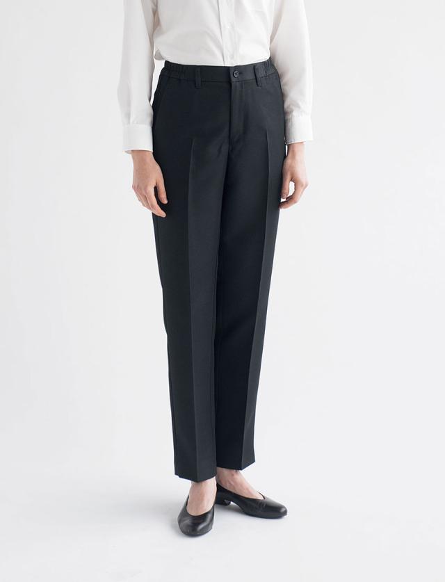ホテル・レストランサービスの多くのシーンで着用する黒パンツの定番です。脇ゴム仕様。シルエットはテーパード、誰が着用してもスタイリッシュになるようなカッティングになっています。ポリエステル100%のギャバジン生地は高級感もあり、洗濯性も高く耐久性にも富んでいます。裾上げはされていない商品です。