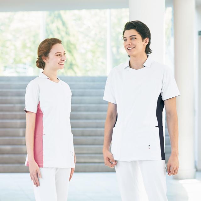 配色カラーでチームや職種を表現できる男女ペアデザインです。レディースは丸みのある小ぶりなショールカラーで優しさを。男性はシャープなスクエアカラーで頼もしさを表現しています。