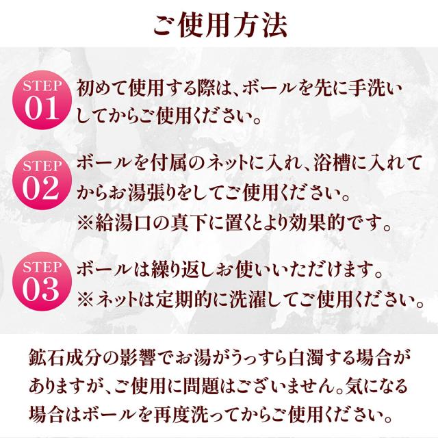 ■説明:お風呂用の遠赤外線ゲルマニウムセラミックボール、トルマリンセラミックボール、銀イオンセラミックボール 麦飯石セラミックボールのセットです。 ボールを付属のネットに入れ、浴槽に入れてからお湯張りをしてご使用ください。(初めてのご使用の際は、ボールを先に手洗いしてください) 繰り返しお使い頂けます。(ネットは定期的に洗濯してください) 残り湯の洗濯機使用可。