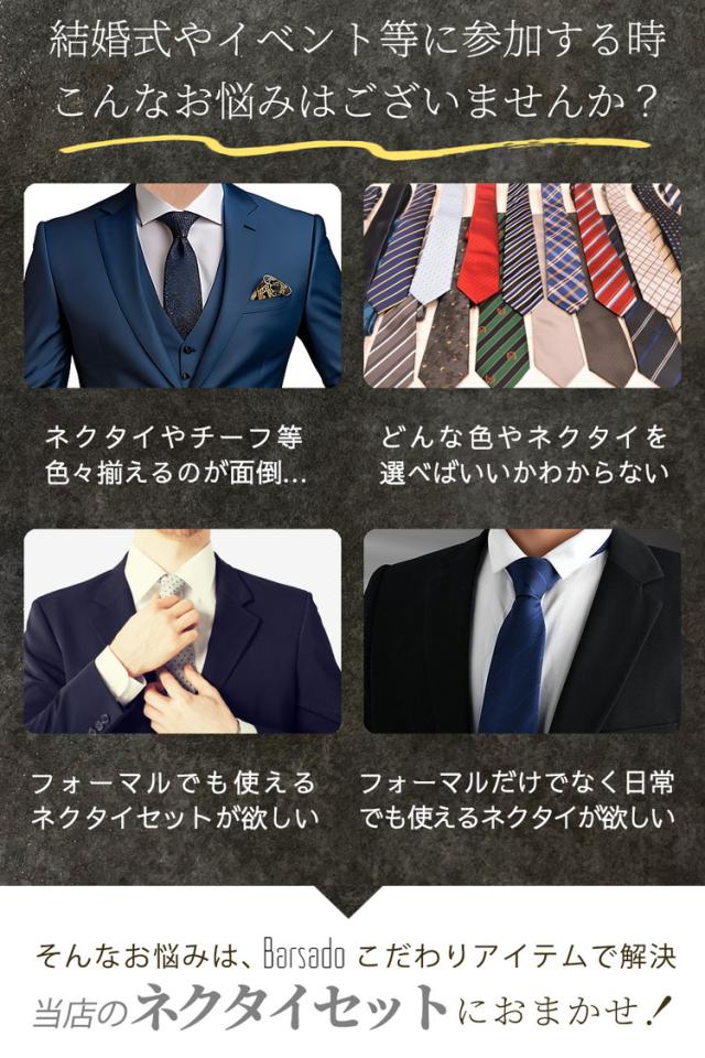 【ネクタイ・ネクタイピン・ポケットチーフ・カフスボタンがセットになった4点セット】