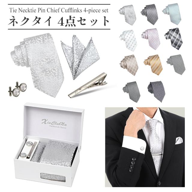ネクタイ 4点 チーフ セット 結婚式 シルバー グレー フォーマル メンズ おしゃれ ネクタイピン ポケットチーフ カフス ボタン ブランド 無地 花柄 メンズ プレゼント ギフト 父の日 紳士服 スーツ 結婚式ネクタイ