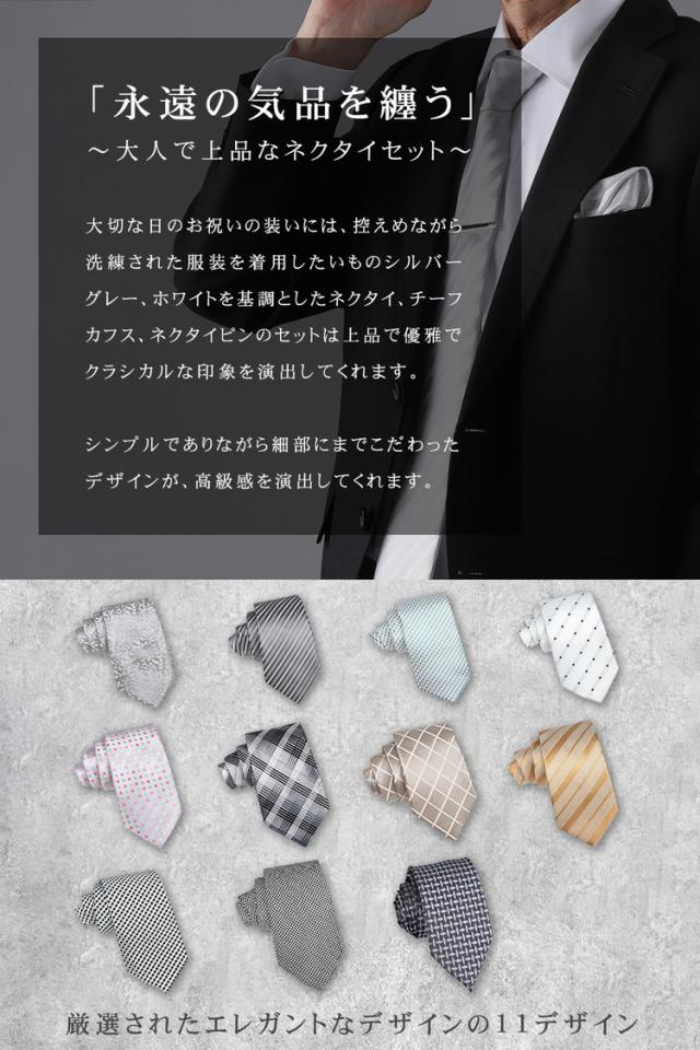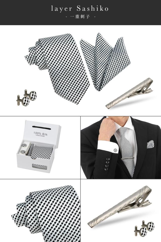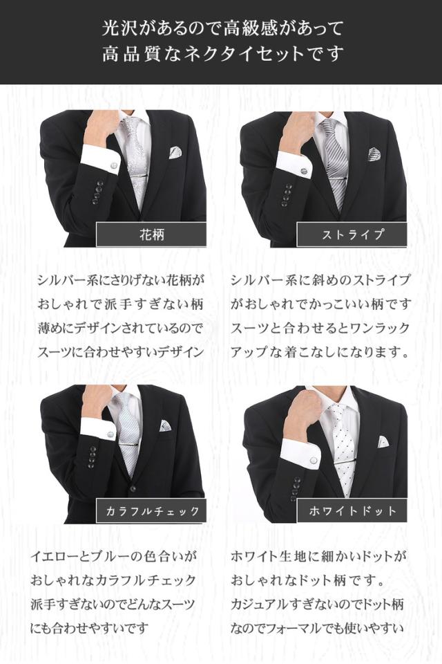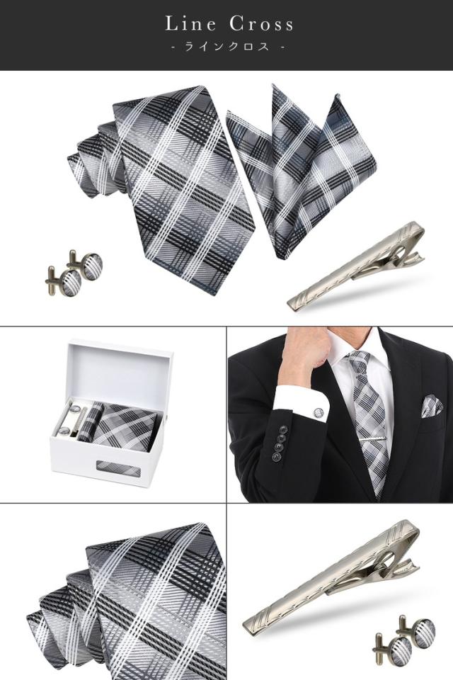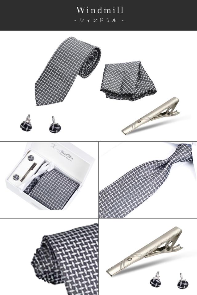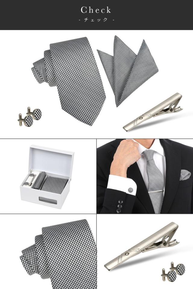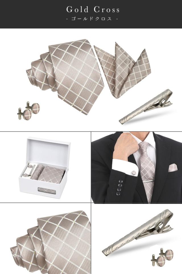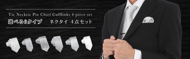 ネクタイ・ネクタイピン・ポケットチーフ・カフスボタンがセットになったとてもお得な4点セットです。