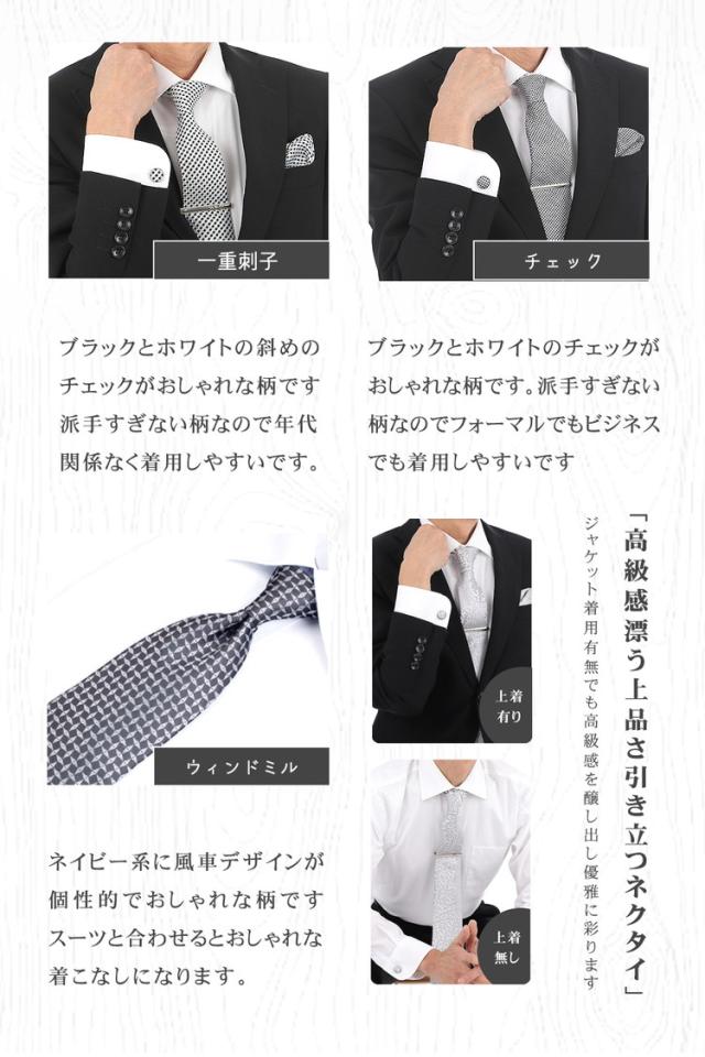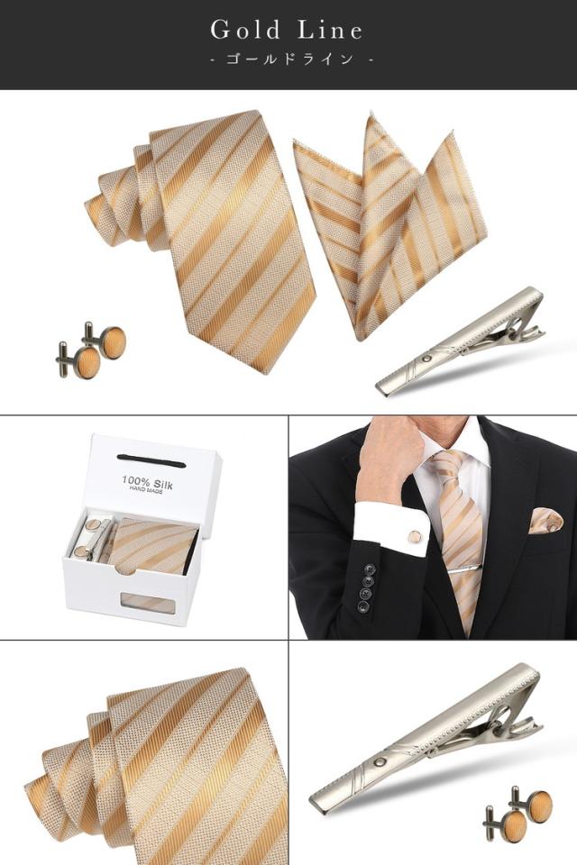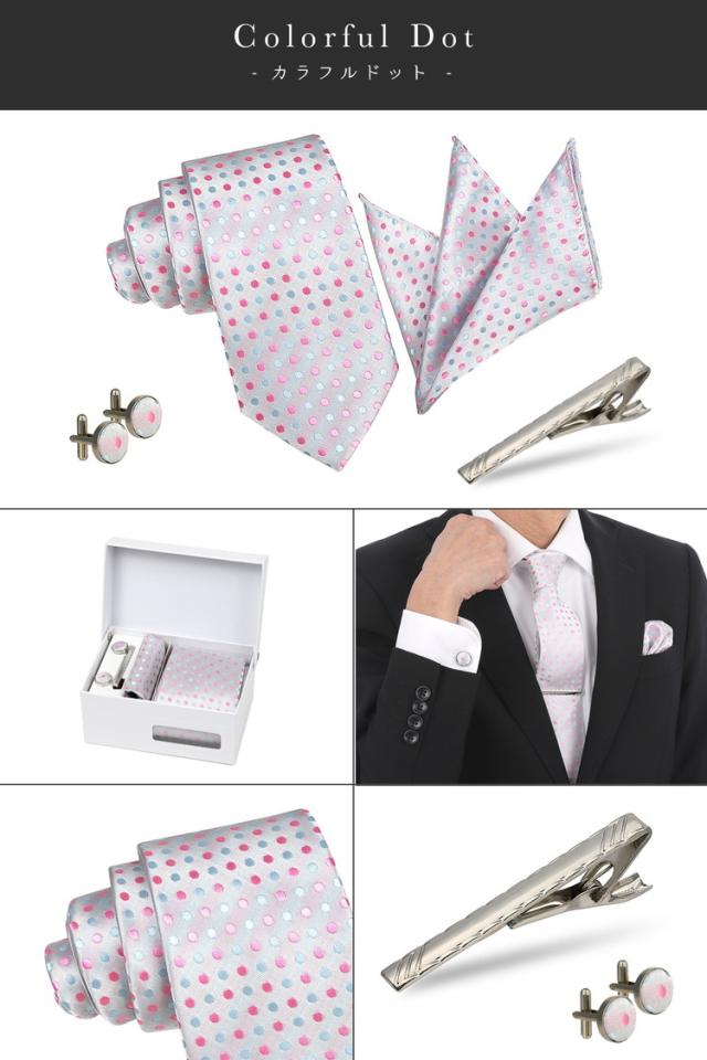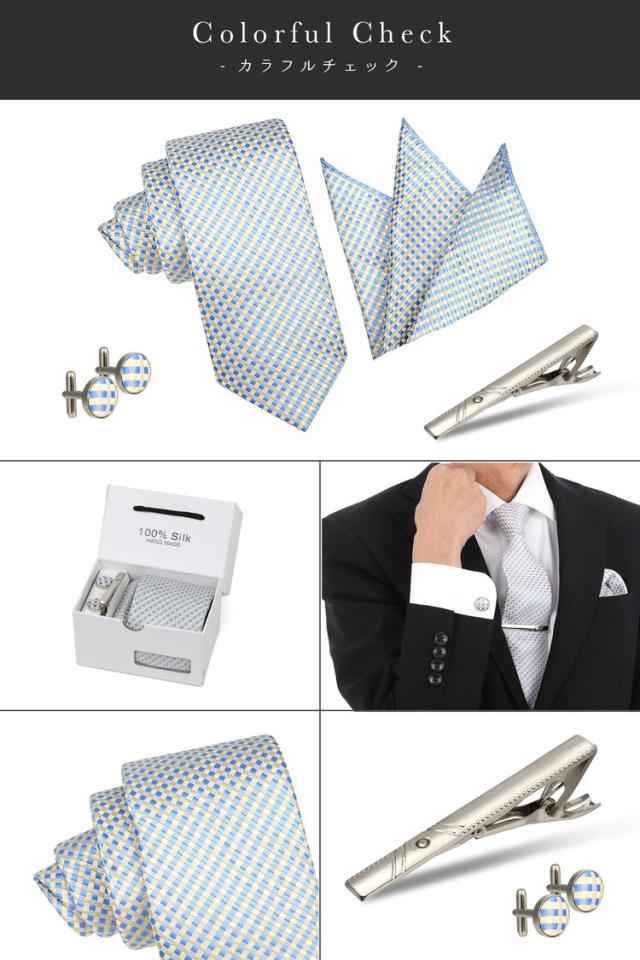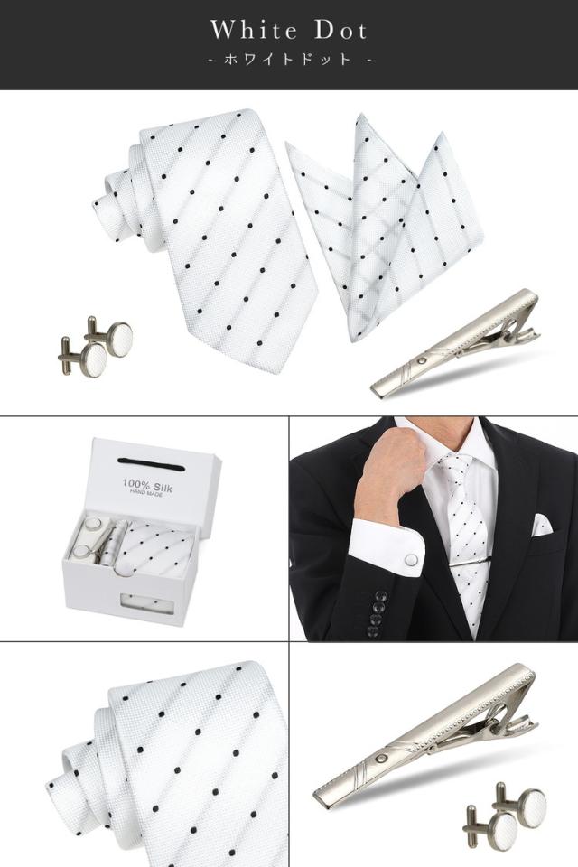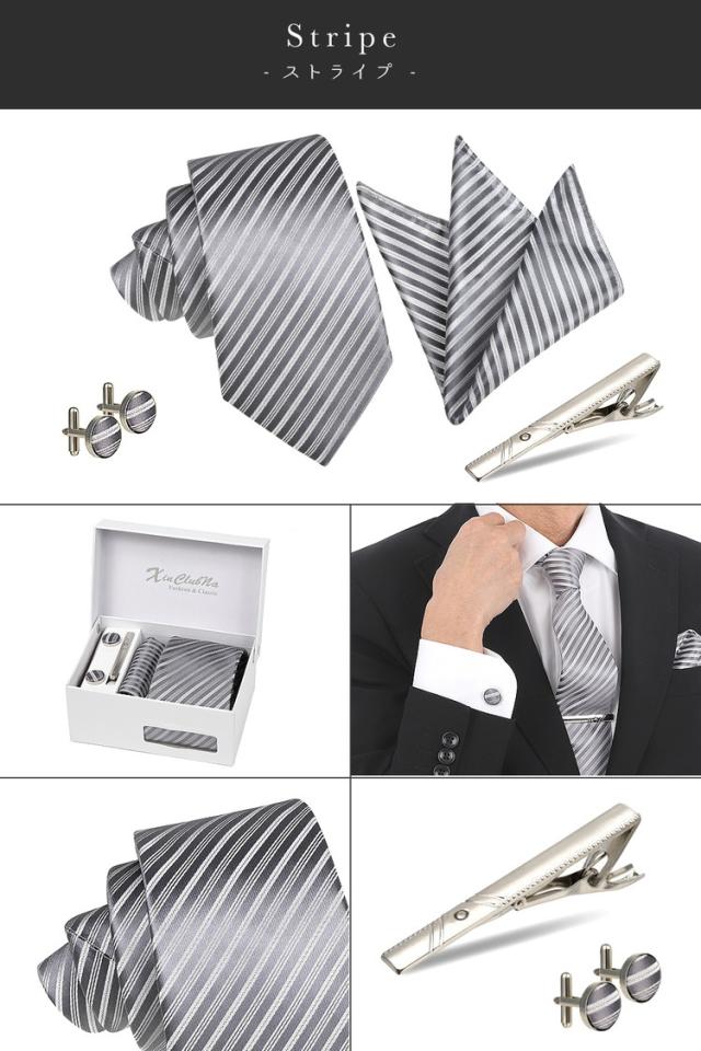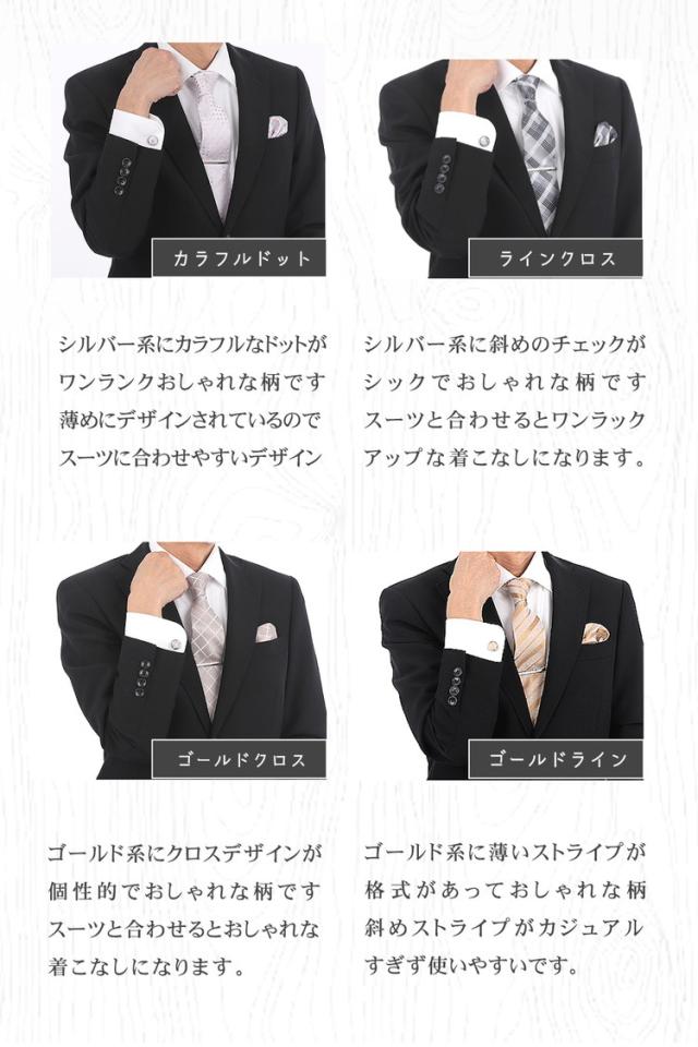 ネクタイ・ネクタイピン・ポケットチーフ・カフスボタンがセットになったとてもお得な4点セットです。