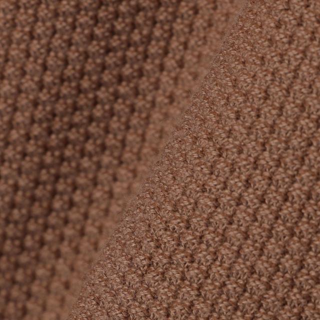 首元の編地は身体に沿うように引き返し編みに、裾と袖口はしっかりとした最大度詰めのリブ編みにするなど、シンプルなデザインながら細部までこだわっています。