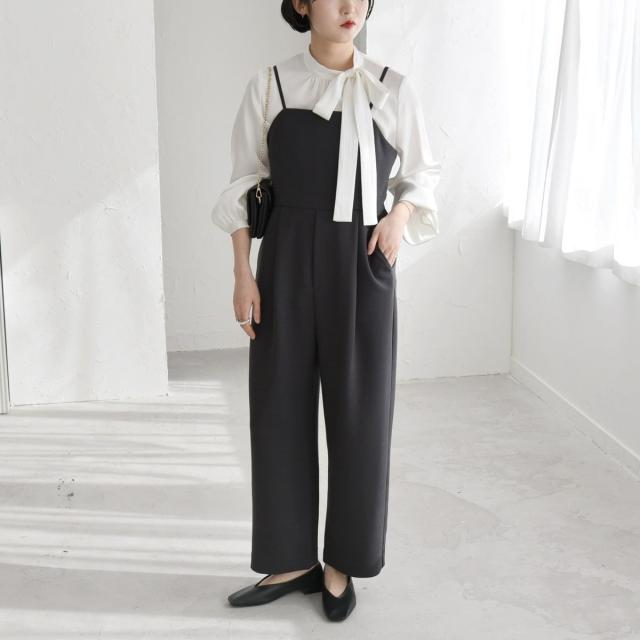 すっきりとしたテーパードシルエットにこだわったキレイ目なサロペット。