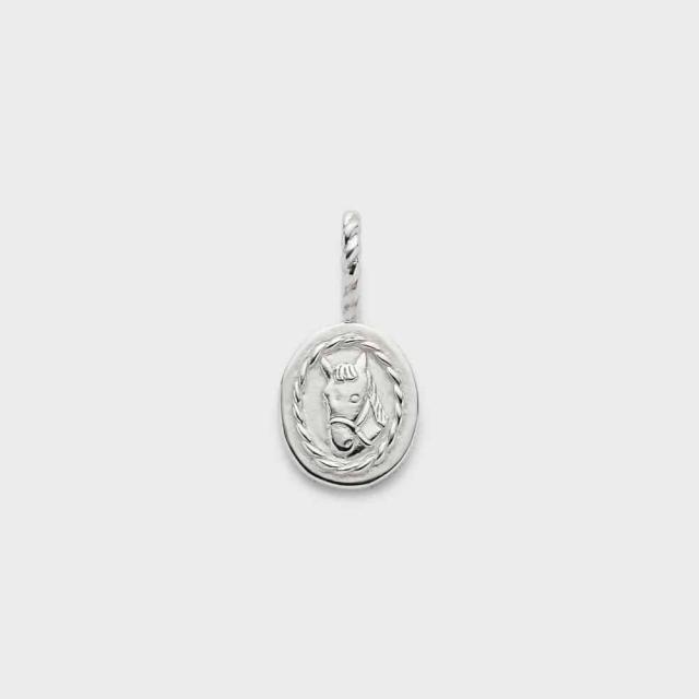 【Custom Charm】フレーム形のチャームとメダル形のチャームを自由に組み合わせてお気に入りのコーディネートを楽しめる、遊び心あふれるチャームシリーズ。自由や幸運の象徴とされる馬をモチーフにしたメダルチャーム。優しい目をした馬の顔と、馬具で用いられるロープをレリーフで表現しました。裏面にはお守りモチーフでもあるホースシューの模様をあしらい、リバーシブルで楽しめるよう雰囲気を変えて仕上げています。同じシリーズのとの組み合わせもおすすめ。フレームチャームの2本のバチカンの間にメダルチャームのバチカンをセットしてからチェーンを通してください。※バチカンに両サイドから負荷がかかると変形して、重ねたいチャームのバチカンが入らなくなってしまう可能性がありますのでご注意ください。※写真のネックレスは別売りです。