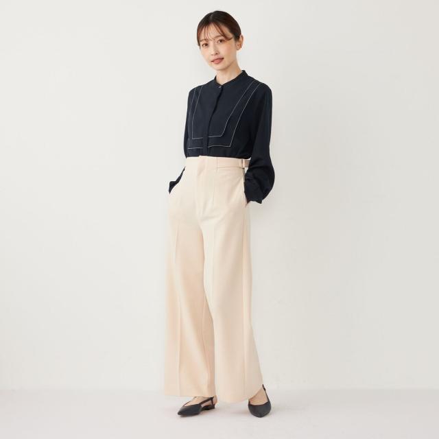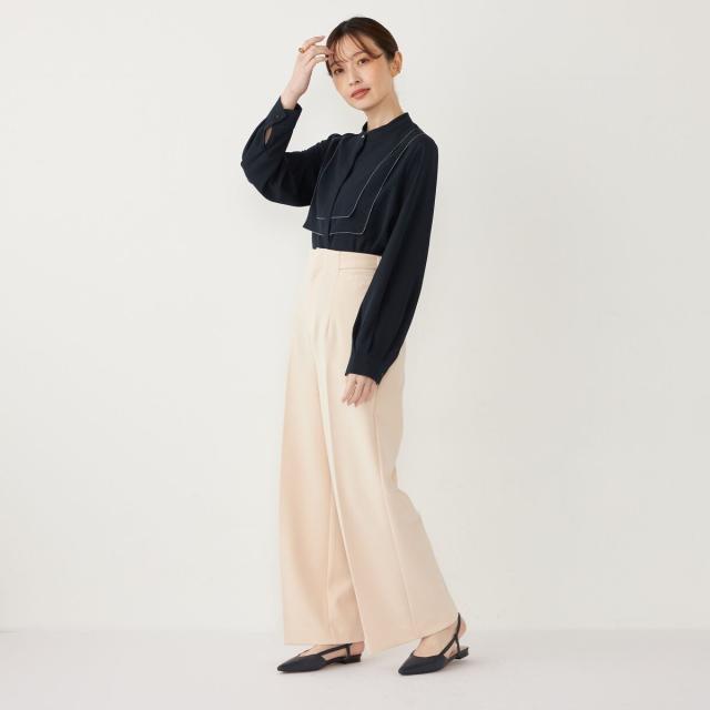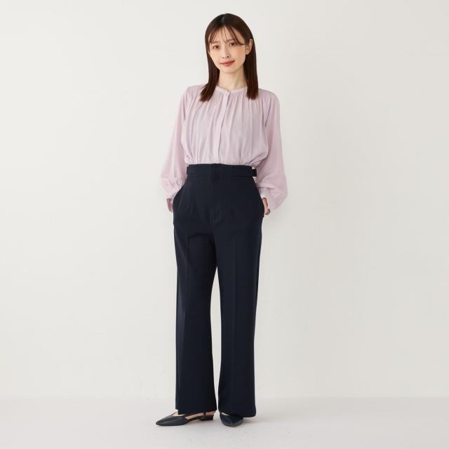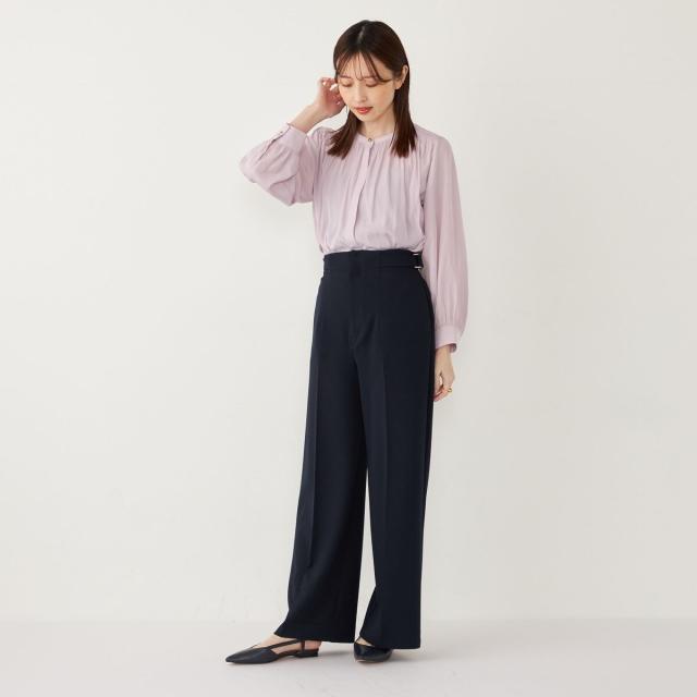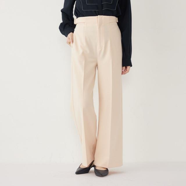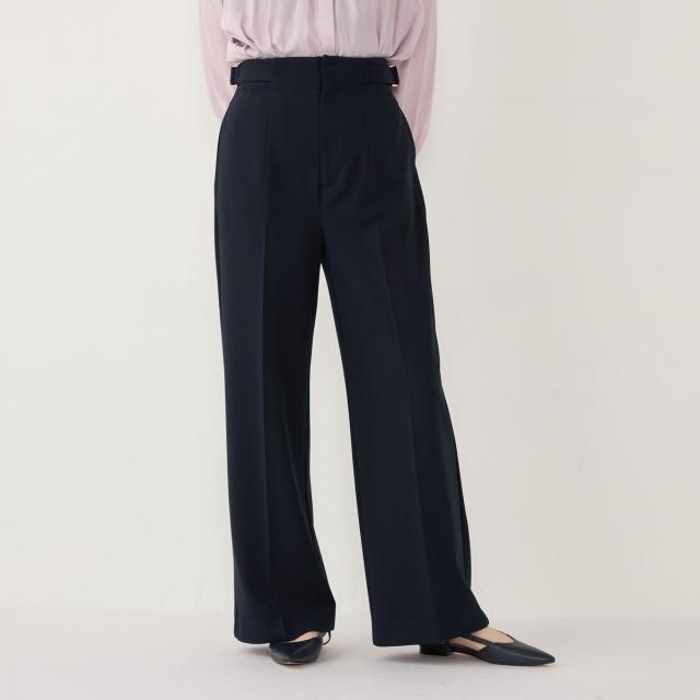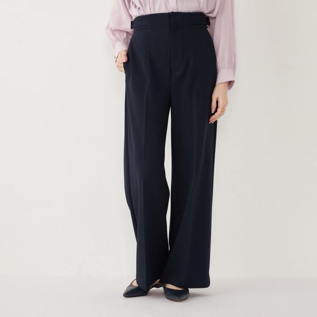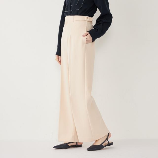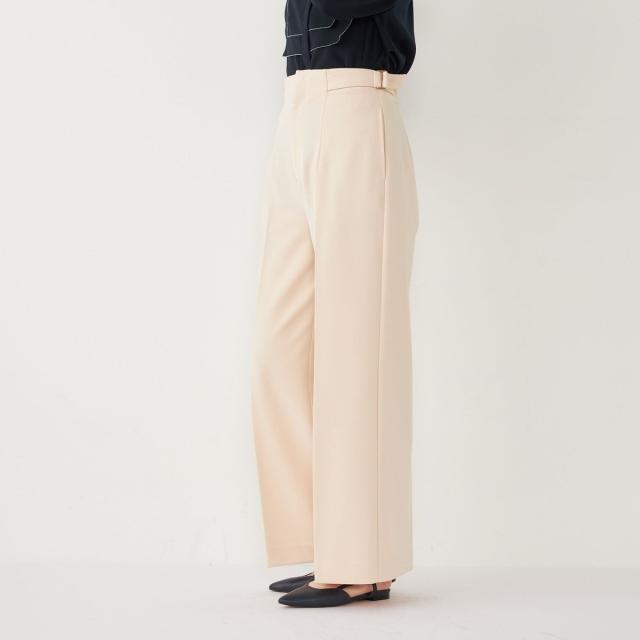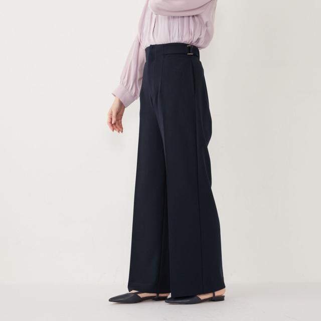 ウエストのサイドベルトがアクセントになった、上品な印象のワイドパンツ。