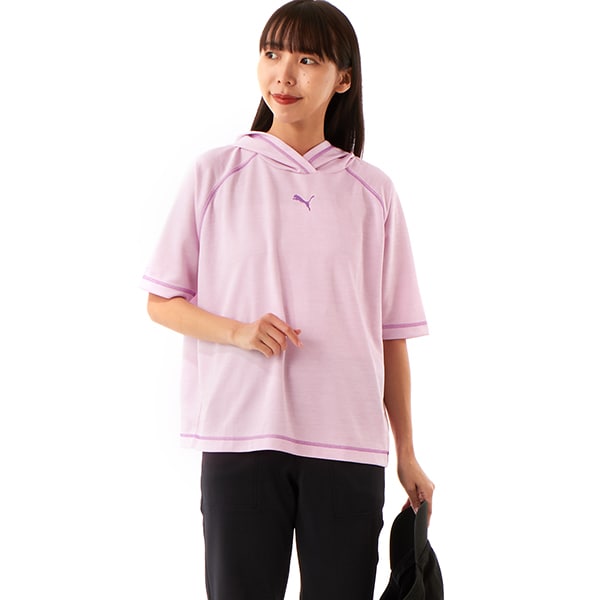裾や袖口に施されたラインと胸元のプーマキャットアイコンがスポーティーな、半袖のフーディ。