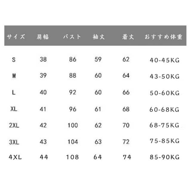 | サイズについての説明 | S肩幅38バスト86着丈62袖丈59おすすめ体重40-45KG M肩幅39バスト88着丈64袖丈60おすすめ体重43-50KG L肩幅40バスト92着丈66袖丈60おすすめ体重50-60KG XL肩幅41バスト96着丈68袖丈61おすすめ体重60-68KG 2XL肩幅42バスト100着丈70袖丈62おすすめ体重68-75KG 3XL肩幅43バスト104着丈72袖丈63おすすめ体重75-85KG 4XL肩幅44バスト108着丈74袖丈64おすすめ体重85-90KG ※サイズは平置き実寸になります。 サイズ表の実寸法は商品によって1-3cm程度の誤差がある場合がございます |
