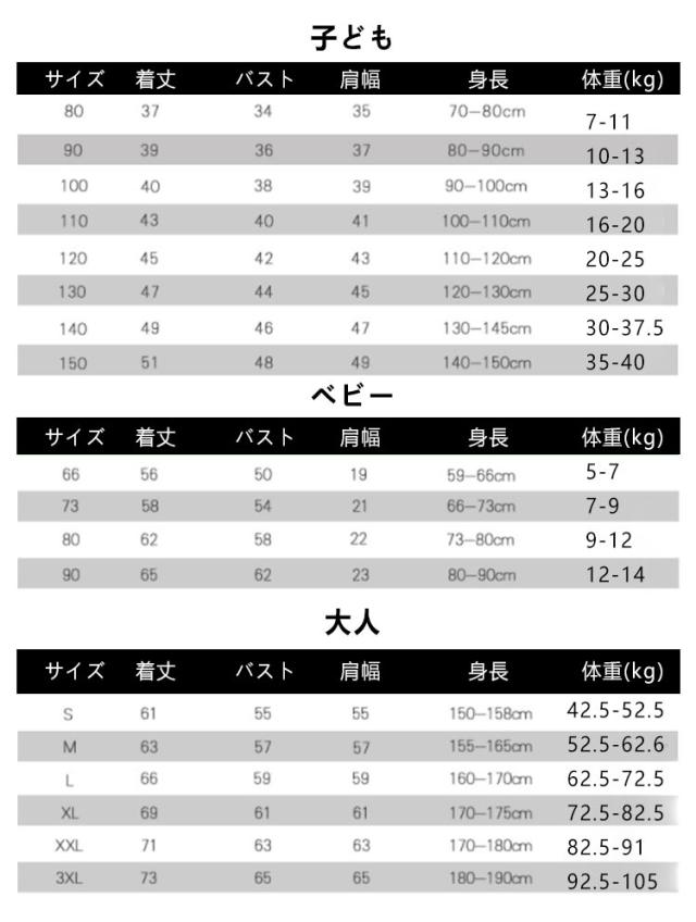 | サイズ | ベビー(帽子付き)66 ベビー(帽子付き)73 ベビー(帽子付き)80 ベビー(帽子付き)90 子ども80cm 子ども90cm 子ども100cm 子ども110cm 子ども120cm 子ども130cm 子ども140cm 子ども150cm 大人S 大人M 大人L 大人XL 大人2XL 大人3XL |