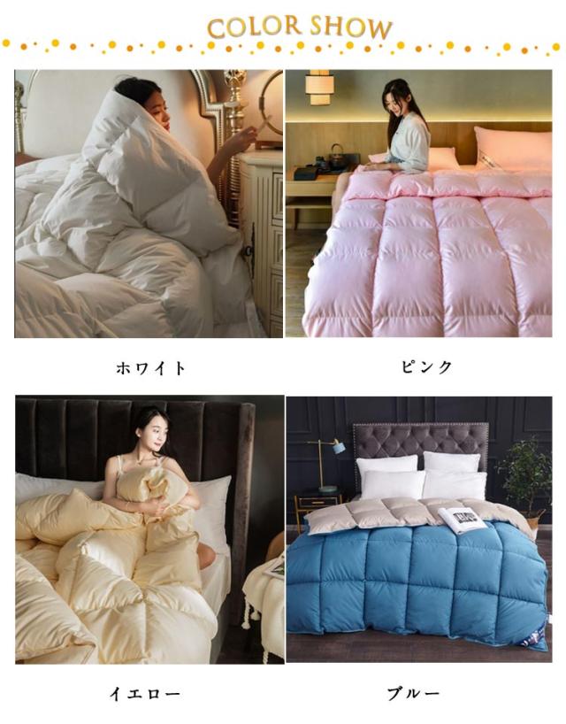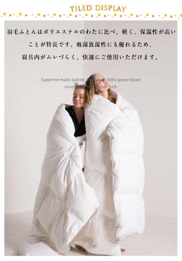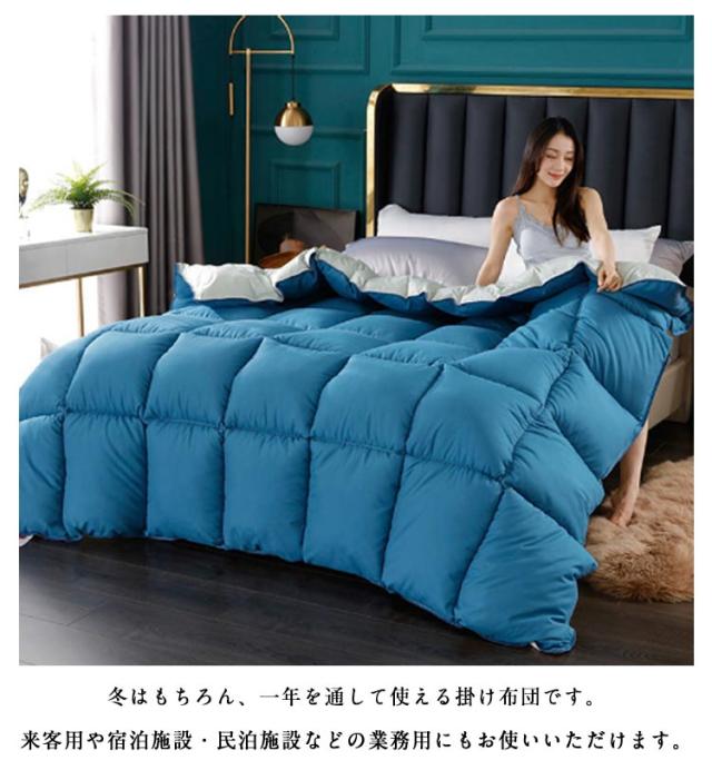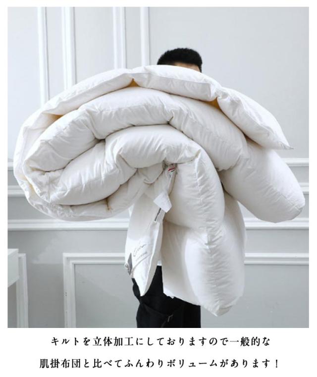 | もっと軽く、暖かに。ダウン95%を使用した掛け布団。【掛け布団カバー付】 羽毛ふとんはポリエステルのわたに比べ、軽く、保温性が高いことが特長です。吸湿放湿性にも優れるため、寝具内がムレづらく、快適にご使用いただけます。 縫い目から熱を逃げづらくするため、上下で異なる二層式のキルトを採用しているため、高い保温力があります。 側生地は肌に優しいコットン生地で、ドレープ性が高く、体のラインに沿うようにフィットします。もちろん、安心の抗菌加工済みです。 キルトを立体加工にしておりますので一般的な肌掛布団と比べてふんわりボリュームがあります! 冬はもちろん、一年を通して使える掛け布団です。来客用や宿泊施設・民泊施設などの業務用にもお使いいただけます。 | |