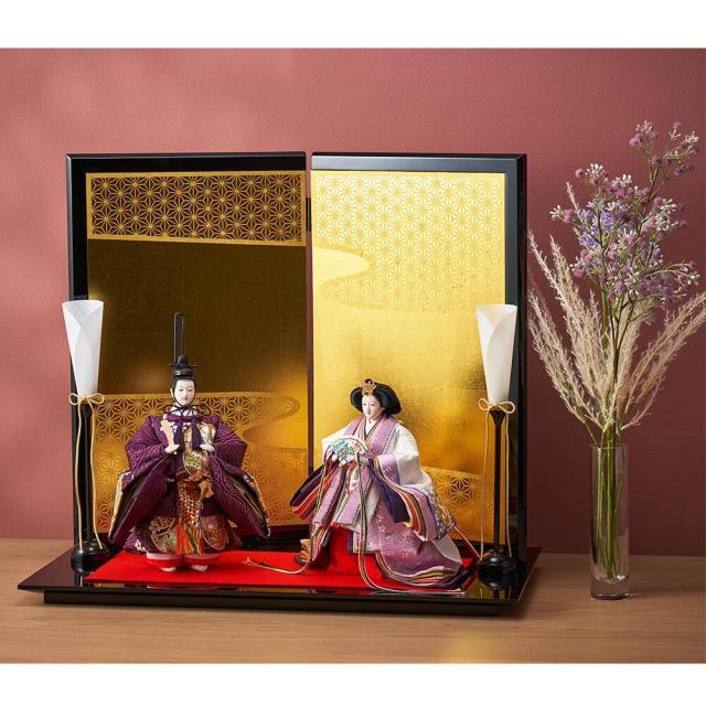 趣のある麻の葉文様を描いた高級感のある屏風に、紫と白のコントラストが素敵な男雛と女雛が上品に映えます。
